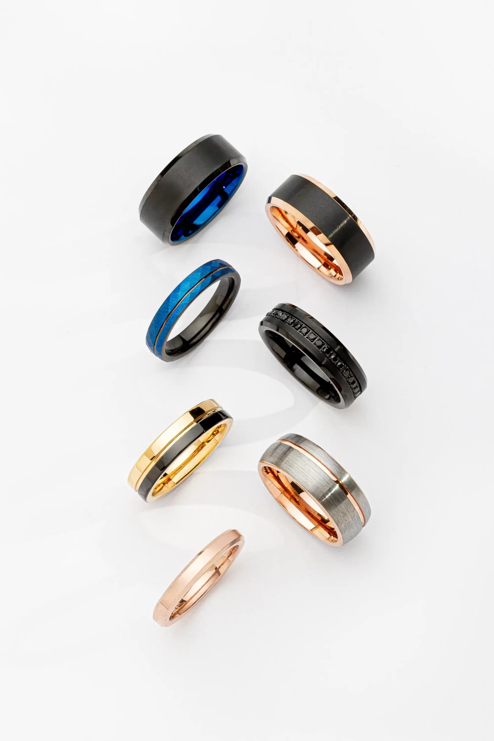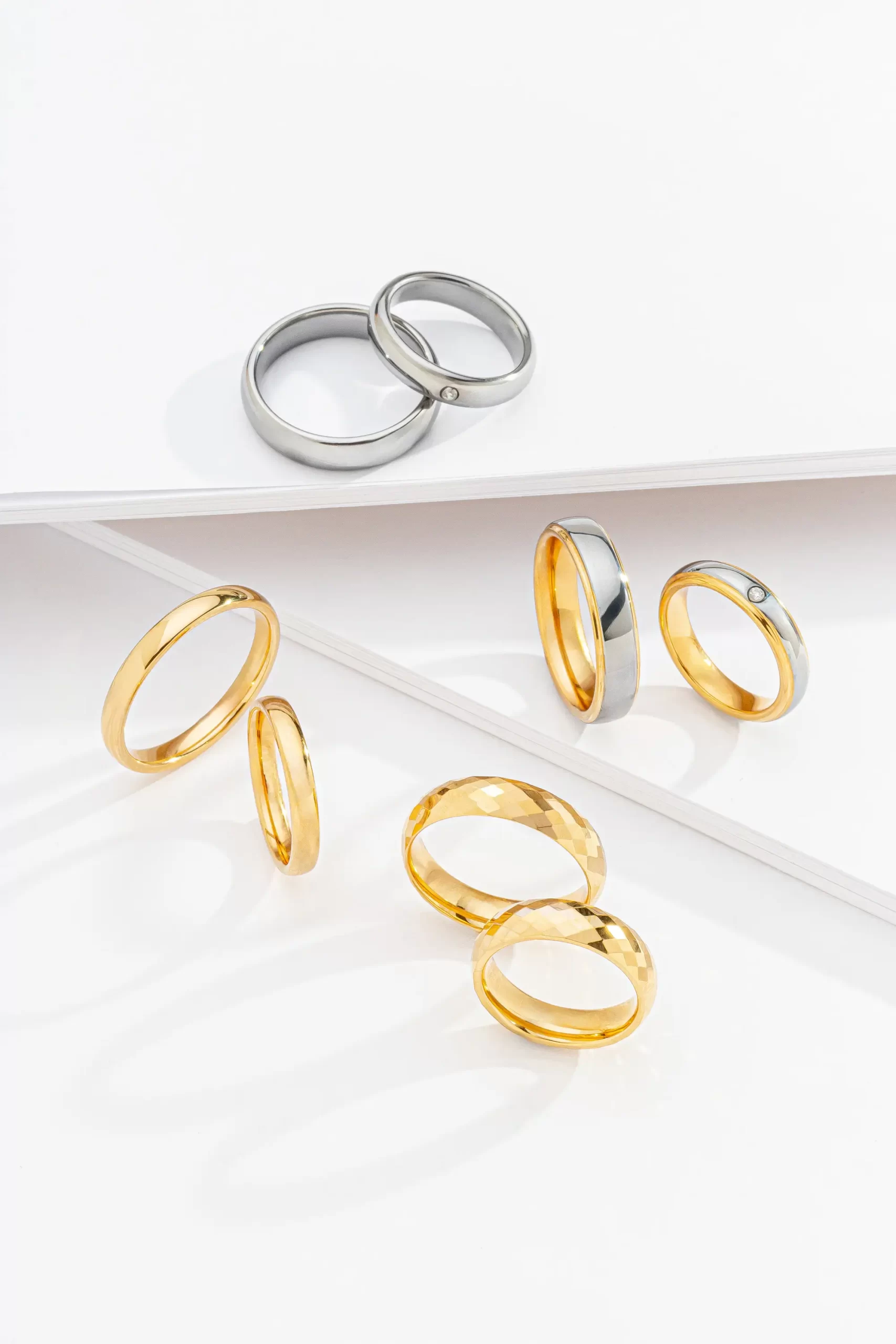 O Tungstênio é o metal mais duro e denso conhecido, com o maior ponto de fusão. Em joias, ele se destaca pela resistência inigualável a riscos e amassados, mantendo um brilho permanente e uma sensação de solidez premium.